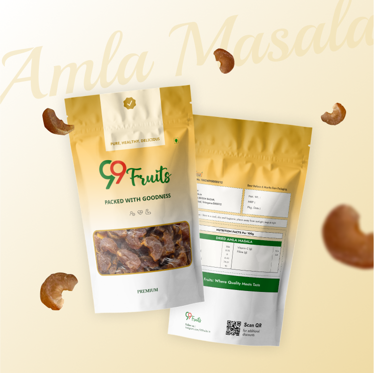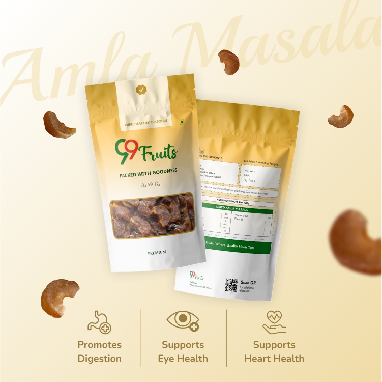 - Premium Dried Amla Masala: A nutrient-dense tasty snack packed in 99 Fruits' premium package.