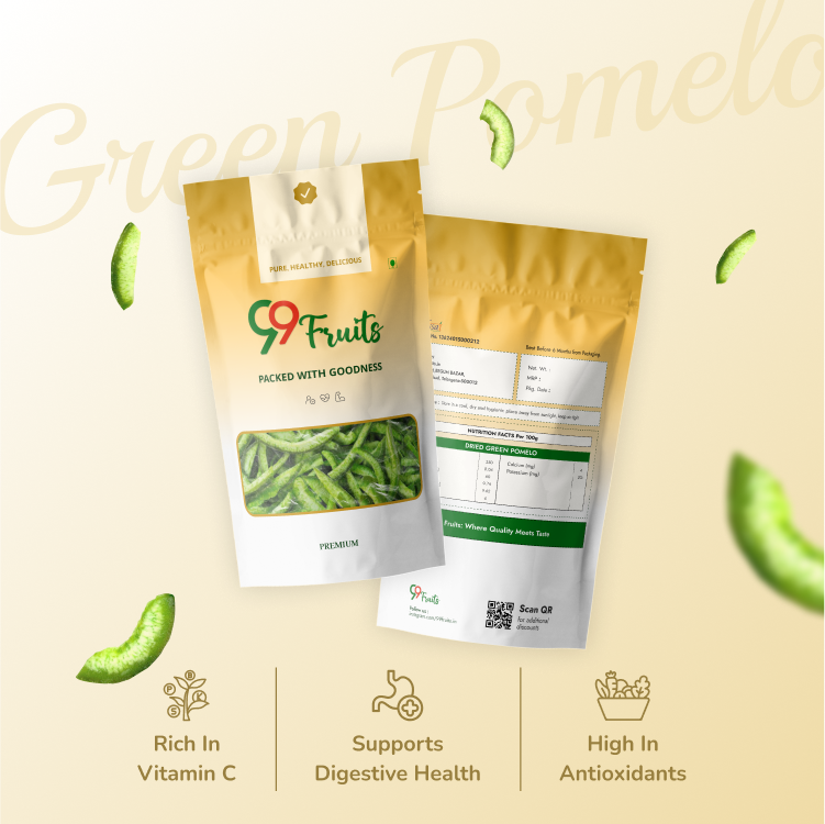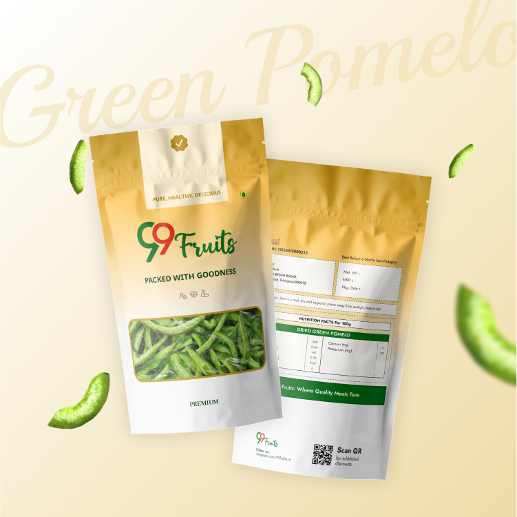 - Premium Dried Pomelo Green: A nutrient-dense tasty snack packed in 99 Fruits' premium package.
