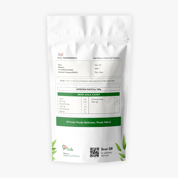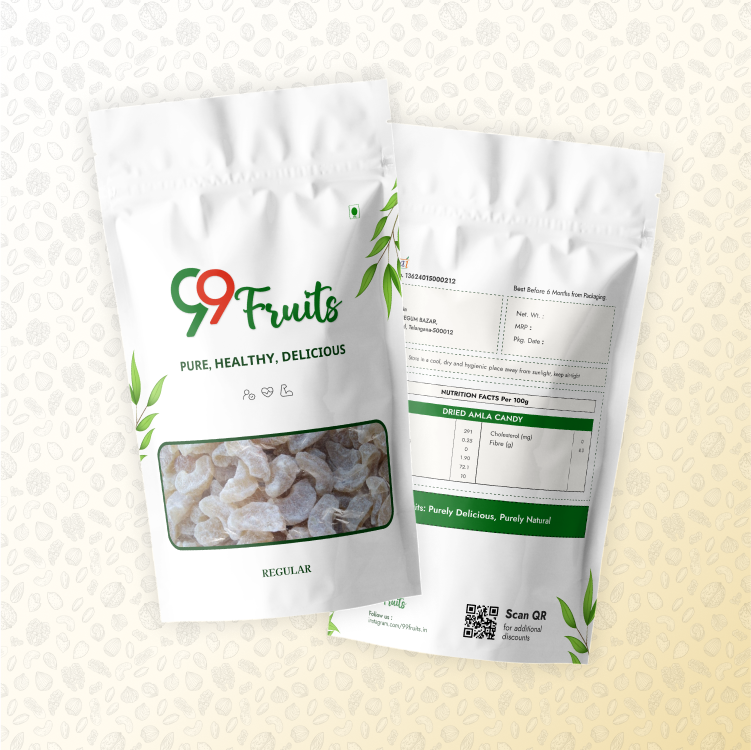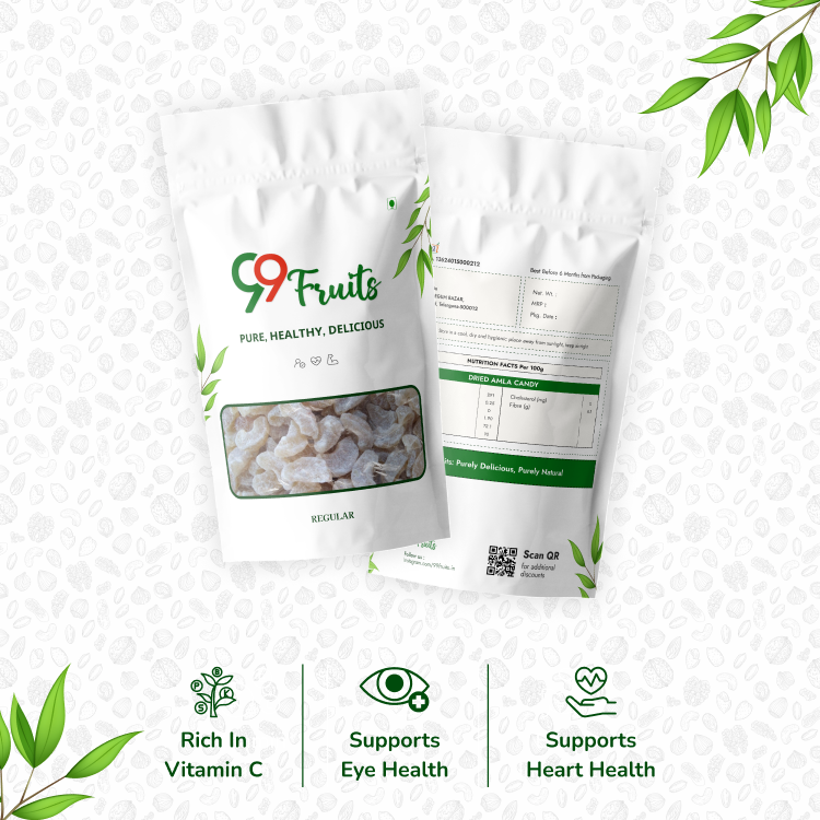 - Dried Amla Candy: A nutrient-dense tasty snack packed in 99 Fruits' regular package.