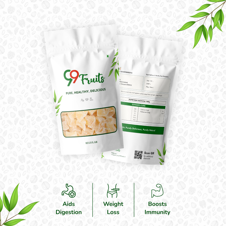 - Dried Ginger Cubes are flavorful and health-boosting snacks packed in 99 Fruits' regular package.